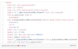 The resulting wat file. You can see the anyref types in the function signature