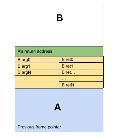 WebAssembly also supports multiple return values. This implies that the stack used by arguments equally stores the callee’s return values. This plays well with tail calls, since we can assume that A has enough space for B’s return values (Fig. 4). The tail calls specification also ensures that B can only tail call a function that returns the same number of values. However, this raises a concern regarding their offsets on the stack